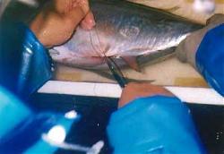 ビンナガ漁期前に漁場の先行調査を行い,情報の提供を行っています。また,カツオ・マグロ類の資源管理に関する基礎資料を収集するため,クロマグロ稚仔魚の調査,カツオ・マグロ類の漁獲デ-タ,生物学的情報等の収集・解析を行っています。 |